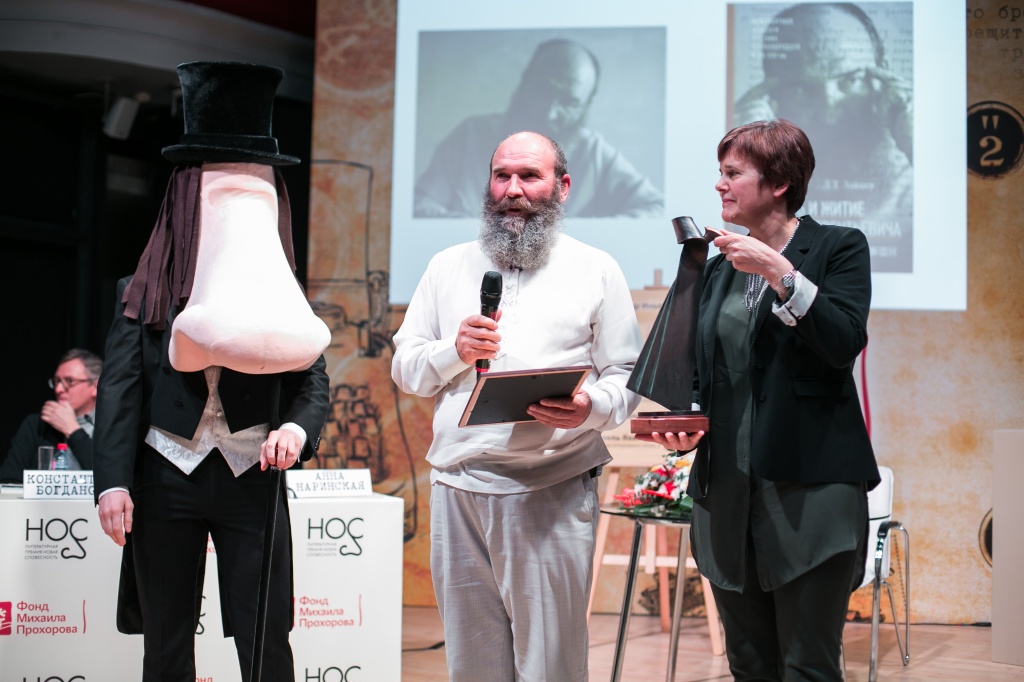 Данила Терентьевич Зайцев, автор и герой собственного жития, между курирующей премию Ириной Прохоровой и героем Гоголя — ожившим Носом