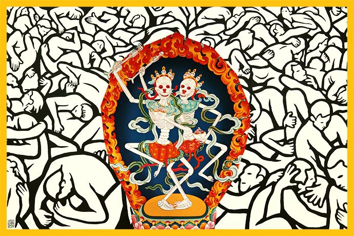 Авалокитешвара, воплощение бесконечного милосердия всех будд, однажды дал монашеский обет спасти всех живых существ от власти иллюзии. Но это оказалось настолько непосильной задачей, что голова его не выдержала и раскололась на одиннадцать частей. Другие будды вошли в положение и помогли Авалокитешваре снова собраться воедино — на этот раз в теле с тысячей рук и с одиннадцатью головами, чтобы спасение всего живого не казалось такой непосильной задачей. В Китае и Японии тибетского Авалокитешвару считают женским проявлением, а зовут соответственно Гуаньинь и Каннон. «На левое плечо Авлокитешвары наброшена шкура дикого оленя, символизирующая добрый и нежный характер сострадательного бодхисаттвы и его способность подчинять заблуждения». Вместо живого оленя рядом с божеством мы видим шкуру убитого парнокопытного, служащую символом доброты. Земное воплощение Владыки взирающего — Далай-ламу — чаще всего приносили в жертву и раз за разом разыгрывали вечную историю умирающего бога.