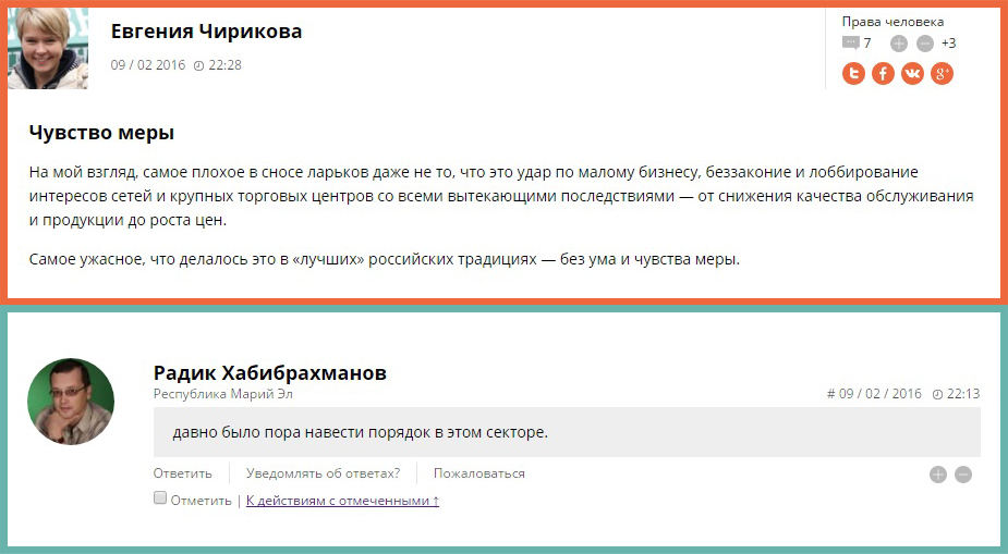 В Москве сносят ларьки, а в интернете бушуют страсти по этому поводу. Говорят об эстетических преимуществах и недостатках конструкций, о том, была ли застройка законной, о том, был ли законным снос, об ударах по средним и мелким предпринимателям, о переделе бизнеса и о том, кто займет освободившиеся места. Но главное – говорят о живых людях, которые стоят за снесенными ларьками.