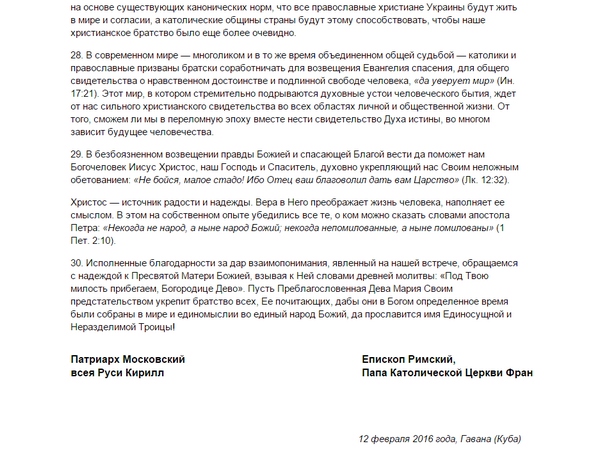 Совместное заявление папы и патриарха Фото: скриншот сайта РПЦ - Рим и РПЦ сожалеют, что «разделены ранами, нанесенными в конфликтах далекого и недавнего прошлого». «Православные и католики должны научиться нести согласное свидетельство истины в тех областях, в которых это возможно и необходимо».