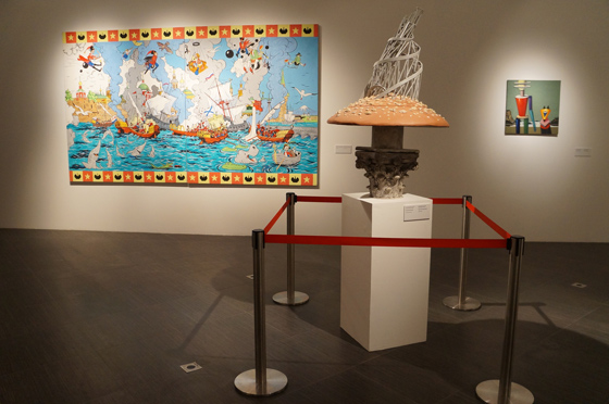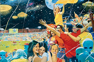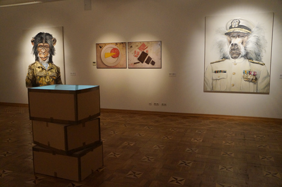 На монументальных полотнах Виноградова и Дубосарского (именно они волей-неволей становятся одним из главных смысловых акцентов на выставке) земляне отплясывают в обнимку с гуманоидами, а pin-up-девица целуется с Микки-Маусом. Под потолком над парадной лестницей болтается скрюченное до состояния эмбриона чучело советского космонавта в поношенном скафандре — еще одно знаковое творение Олега Кулика, в 2005 году ездившее на выставку «Russia!» в Музее Гуггенхайма.