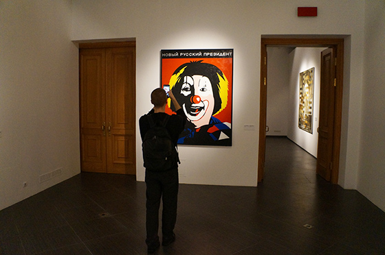 Так, осознанно или нет, выставка вобрала в себя несколько не относящихся напрямую к коллекции сюжетов, главный из которых связан с рождением бренда «современное российское искусство» (на выставке также есть работы украинских художников того времени, но сейчас такое объединение искусства двух стран без уточнения его причин выглядит все более сомнительно). Он сложился из иронии на грани с психоделией и угаром, подчеркнутой фигуративности и визуальной агрессии. Нужны были новые коды описания и восприятия искусства, и они были найдены где-то между травести-шоу Владислава Мамышева-Монро и «Новым русским президентом» в образе Рональда Макдональда Константина Латышева.