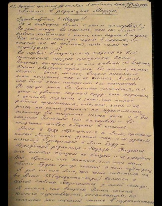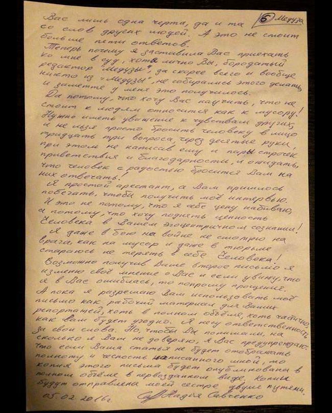 После этого я написал Савченко письмо и приложил к нему все те же 33 вопроса, пометив «более важные» жирным шрифтом. Однако вместо ответов от Савченко 12 февраля через «Росузник» пришло письмо, которое мы решили опубликовать целиком. Украинская летчица и сама говорит, что не против его публикации, а редакции «Медузы» кажется, что читать это письмо куда интереснее, чем гипотетическое интервью.