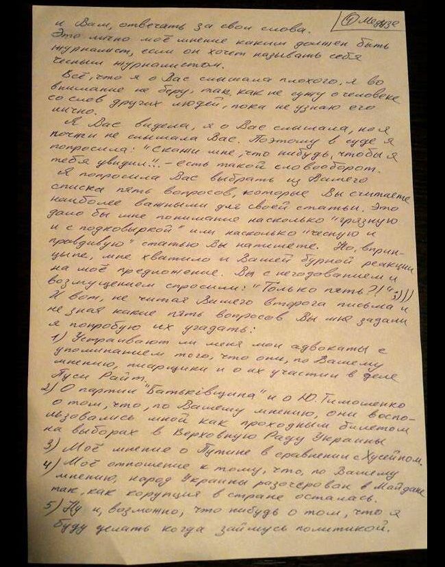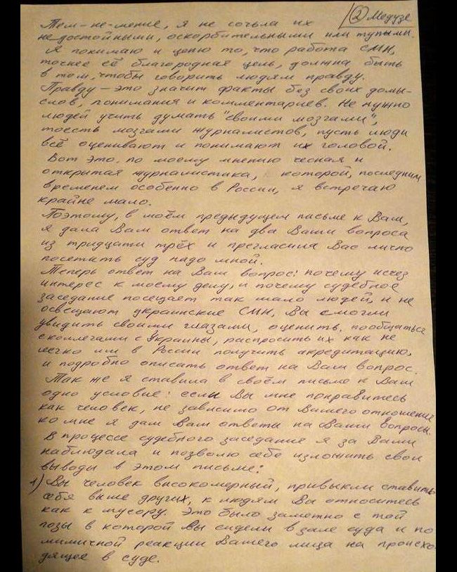 Возможно, получив Ваше второе письмо я изменю своё мнение о Вас и если увижу, что я в Вас ошиблась, то попрошу прощения. А пока я разрешаю Вам использовать мое письмо как рабочий материал для Ваших репортажей, хоть в полном обьеме, хоть частично как Вам будет угодно. Я несу ответственность за свои слова. Но, чтобы Вы понимали, насколько я Вам не доверяю, я Вас предупреждаю что если Ваша статья не будет отображать полноту и чесность написанного мной, то копия этого письма будет опубликована в полном объёме в первозданном виде. Копии будут отправлены моей сестре двумя путями.