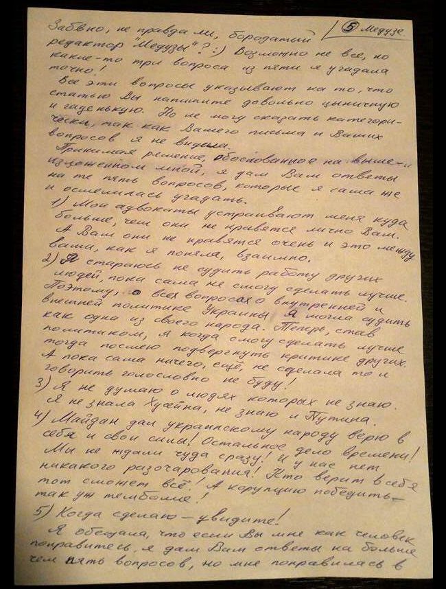 Первое письмо от летчицы пришло 25 января. В нем она написала, что «потратила четыре часа и ответила письменно на все 33 вопроса», но просто так их не отдаст. «Если я увижу корреспондента из „Медузы“ в следующих судебных заседаниях, и глаза этого человека покажут мне искренность — неважно, в хорошем или плохом ко мне отношении, — я отдам ему ответы на вопросы», — назвала свое условие Савченко. Она добавила, что «вопросы звучат, конечно, странно и хамовито», зато теперь она понимает, «с какими вопросами от оппонентов ей придется сталкиваться».