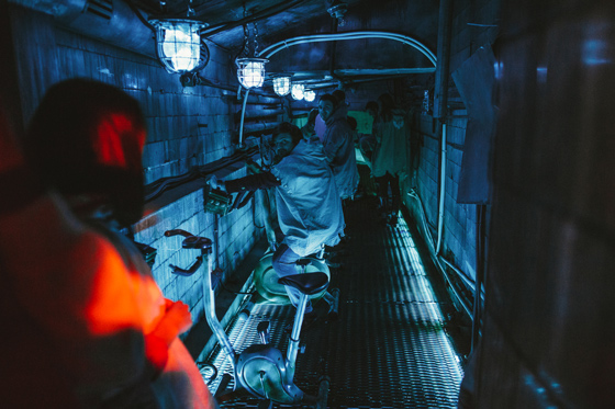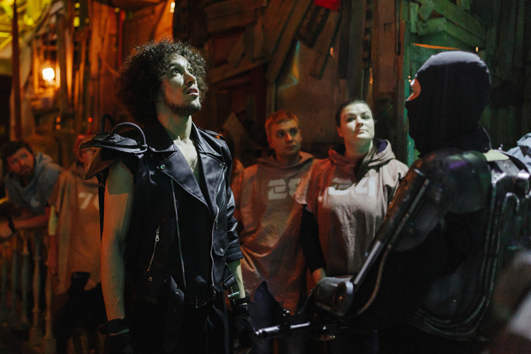 От дисциплины, начальственных окриков и построений я отвык со средней школы; когда солдат в черной балаклаве велел нам, якобы беженцам, встать в шеренгу, на какое-то мгновение забываешь, что все это спектакль, и почти перестаешь сомневаться в серьезности его намерений. Было по-настоящему страшно. В то ли ролевой игре, то ли самостоятельной театральной постановке «МСК 2048» правила нужно усваивать на ходу: инструктаж от высших военных чинов проходит быстро, к тому же перепуганные новички забудут половину через пять минут. Если вам понадобится что-то уточнить или разузнать, можно обратиться к «оракулу» — истукану с металлическим голосом. Иногда за железной маской скрывается не кто иной, как создатель этой постапокалиптической вселенной. Ученик Кирилла Серебренникова режиссер Александр Созонов, ставивший в «Гоголь-центре» и в обновленном Театре им. Ермоловой, не только направлял команду артистов — в «МСК 2048» он выступил в непривычном амплуа игрового разработчика.