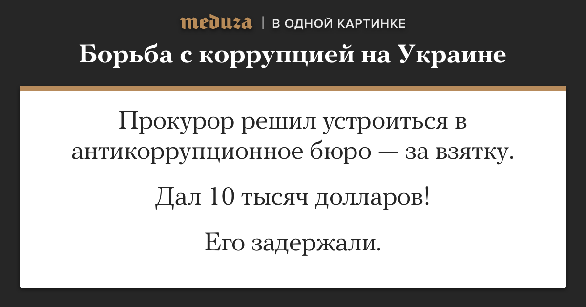 Дата17.02.2016АвторСкрытИсточникМедузаСохранённая копияInternet ArchiveOriginal MaterialShow translationБорьба с коррупцией на Украине. В одной картинкеПрокурор попытался устроиться в антикоррупционное бюро — за взятку! Фото в анонсе: Владислав Содель/Коммерсантъ