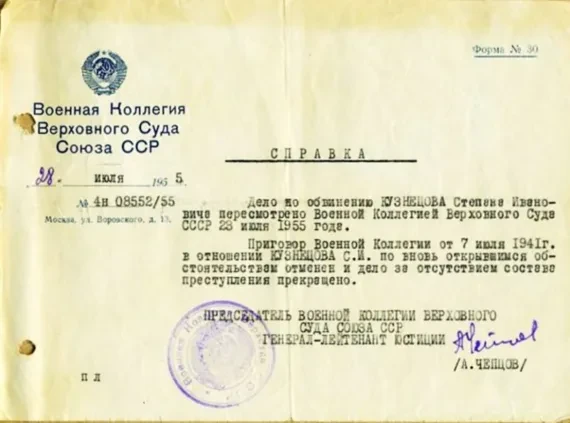 В 1955‑м, когда дедов срок закончился, семья Прудовских приехала в Москву из Тбилиси (там служил отец) — встречать его. Сергею Борисовичу было тогда шесть лет, он помнит, как увидел Степана Ивановича Кузнецова, своего дедушку, в первый раз: в окне Измайловской больницы, куда тот попал сразу после освобождения (с больным сердцем). Уставшее лицо, длинная седая борода, усы. Шестьдесят шестой день рождения дед встретил в больнице. Прямо туда ему принесли справку о реабилитации. Приговор отменен, дело прекращено за отсутствием состава преступления.