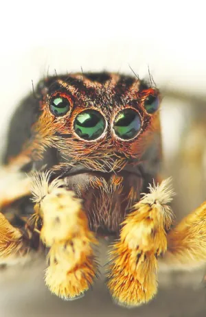 Скорее всего, многие наши читатели хоть раз да играли с кошками лазерной указкой. Подобную игру можно затеять и с пауками-скакунчиками. Они точно так же реагируют на движение лазерной точки. Вообще, по словам Галины, пауки-скакунчики — это удивительное исключение из мира пауков. И не только потому, что с ними можно играть, как с кошками. Они одни из немногих, кто видит и реагирует на свое отражение в зеркале. Вот смешной паучок на видео подходит к зеркалу и забавно расставляет лапки, будто радуясь своему отражению. Но на самом деле, как поясняет мне Азаркина, никакой радости он не испытывает. Просто, увидев изображение, думает, что ему навстречу идет еще один самец, и пугает соперника. Угол зрения у пауков-скакунчиков — практически 360 градусов. При этом у передних глаз область зрения узкая, но с высокой четкостью, а у боковых — наоборот. Так что боковые глаза хорошо фиксируют движения (на расстоянии до 3 м), а центральные позволяют рассмотреть объект подробнее (30 см — фиксация объекта, 10 см — окончательное распознавание).
