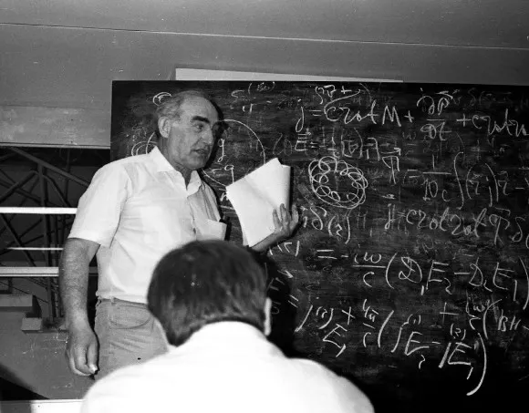 Халатников вел рассказ своим мягким голосом, аккуратно рисуя графики и покрывая доску системами уравнений, не пользуясь при этом никакими бумажками. Плавно текущий доклад спокойно переплетался с вопросами, на которые Халат отвечал четко и вежливо, пока в игру не вступил Немцов: