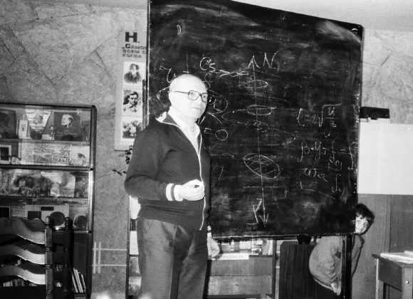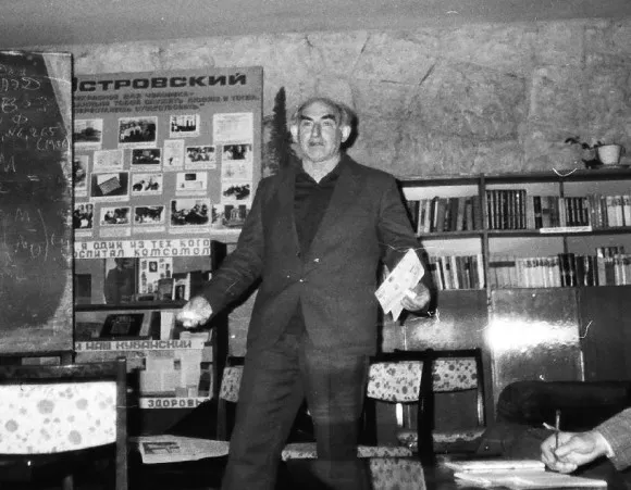Снимок наверху сделан во время доклада Гинзбурга в той самой библиотеке Малого Ахуна. Библиотека носила имя Николая Островского, что отчетливо видно на большом стенде за доской. На нем можно прочитать один из лозунгов библиотеки, цитирующих Островского: “Я один из тех, кого воспитал комсомол” .