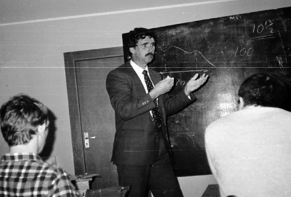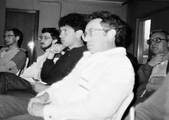 На следующем снимке показана примерно та же часть библиотеки с доской у которой Михаил Незлин из Курчатовского института, докладывает о результатах своего эксперимента, которому вскоре предстоит стать знаменитым. В этом эксперименте впервые в лаборатории, были возбуждены и проявили устойчивость вихри Россби. Незлин построил свою “установку» в основном из предметов домашнего обихода. Например, чтобы вращать ось с паучком в маленьком сосуде, он купил в «Детском Мире» игрушечный двигатель с диаметром в два сантиметра.