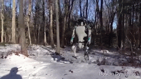 Компания Boston Dynamics, принадлежащая Google, продемонстрировала возможности последнего поколения двуногих роботов Atlas. Сначала робот-гуманоид гуляет по зимнему лесу, ловко удерживая равновесие и не падая, даже когда его ноги проваливаются под снег.