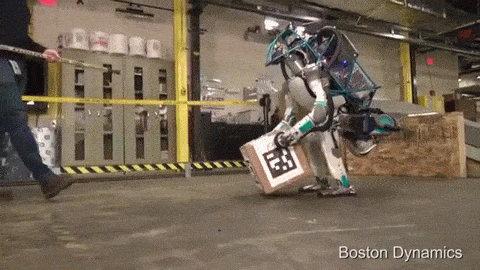 Затем Atlas показал, как он может поднимать и переставлять коробки. А потом начались издевательства: человек с хоккейной клюшкой выбивал из рук робота его любимую коробку и толкал его самого. Откуда мы знаем, что коробка любимая? Atlas, не взирая ни на что, упорно пытается ее обнять. И в итоге побеждает