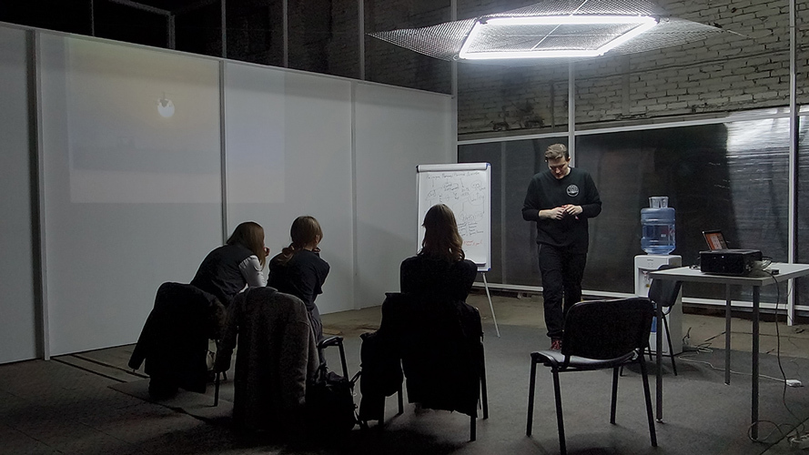 © Александр Образумов Александр Образумов. «Содержание конфиденциально» Другие главные персонажи тренинга — путешественник во времени Джон Тайтор, появившийся в интернете в 2001 году и заявивший, что прибыл из 2036-го, и пилот Джон Бойд, консультант Пентагона, разработавший на основе квантовой физики метод реагирования на ситуации, вошедший в обиход разведки, армии и бизнес-менеджмента. Семинар HCW построен по принципам Бойда: это четыре цикла «наблюдение — ориентация — решение — действие». В каждом семинаре обязательно присутствует теоретическая часть, в которой художник смешивает наработки квантовой физики, философию Агамбена, исследования Бориса Поршнева и других загадочных фигур. К теории добавляются разветвленный визуальный материал (на одних семинарах это картинки из Гугла и комиксы, на других — фильм конспирологического характера) и практические методики: участники погружают пальцы в зернистую жидкость и заряжаются ионами, медитируют или расставляют объекты таким образом, чтобы их магнитные поля служили глушилками для электронных устройств. Сам тренер в модной водолазке с атрибутикой Джона Тайтора стоит на фоне баннеров, покрытых надписями, выполненными сайентологическим шрифтом, кулеров с водой и флипчартов, на которых мелькают физические формулы, диаграммы и функции. Число участников ограничено, одну сессию может посетить только четыре человека. Это позволяет тренеру обращаться индивидуально к каждому и использовать его личный опыт в собственном повествовании. Также художник пользуется методами холодного чтения и одитингом Рона Хаббарда, постоянно задавая личные вопросы и интерпретируя их в научном ключе.