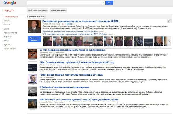 Страница новостного агрегатора "Новости Google", news.google.ru Новостные агрегаторы — это, как правило, сервисы крупных поисковиков, которые собирают новости с сайтов различных СМИ, обрабатывают их при помощи некоего алгоритма и представляют своим посетителям самые интересные, обсуждаемые или свежие материалы. Иногда работа агрегаторов полностью автоматизирована, как, например, у сервисов «Яндекс.Новости» или «Новости Google», иногда все-таки существует редакции, как в «Рамблер.Новостях».
