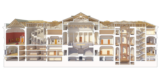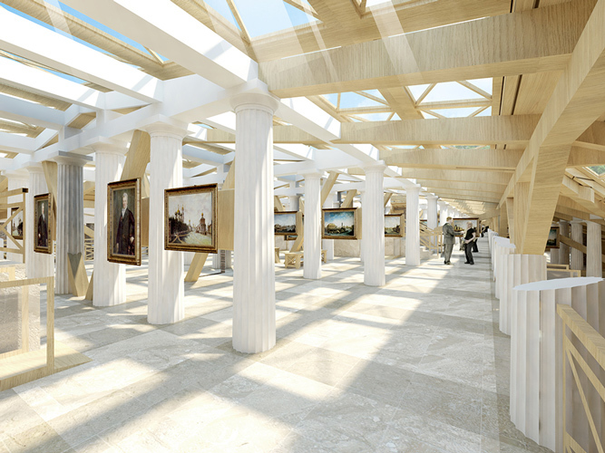 «Я тщательно разработал проект мансардных помещений, чтобы сохранить все старинные балки Карла Росси: на них должна разместиться экспозиция, — рассказывает архитектор. — По существу дела эта реконструкция является дизайном экспозиции, своего рода архитектурной инсталляцией».