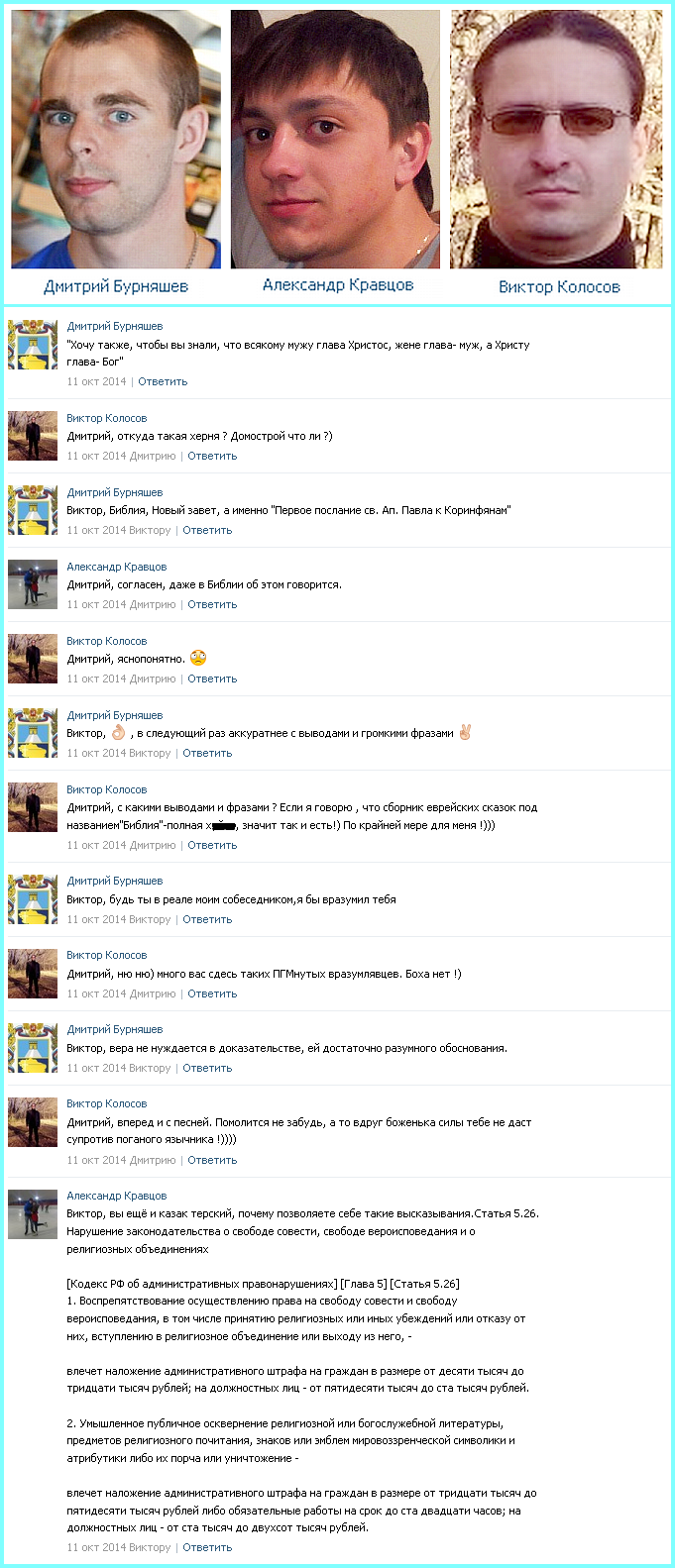 Истцы ввели меня в заблуждение, не указав авторство и источник текста, я подумал, что эта цитата является отрывком из Домостроя, который пропагандирует физическое насилие в отношении жен и детей, и я обругал этот отрывок. Но после того, как истцы указали, откуда эта цитата, я успокоился и сказал, что все понял, но истцы не остановились на этом и продолжали конфликт, опубликовав в обсуждении следующие фразы: "Виктор, в следующий раз аккуратнее со своими выводами и громкими фразами. Виктор, будь ты в реале моим собеседником, я бы вразумил тебя". Я считаю, что эти фразы несут в себе скрытые угрозы физической расправы, а также эти фразы оскорбительны по отношению ко мне. Истцы обращались ко мне на "ты", хотя мы не знакомы, и я намного их старше по возрасту. Далее истцы приводят еще одну цитату из Нового Завета, в которой они употребляют по отношению ко мне слово "еретик". То есть верующий человек, сознательно отклоняющийся от господствующих религиозных догматов. Это оскорбительно для меня, так как я атеист и не придерживаюсь никаких религиозных догматов вообще. Далее истцы стали угрожать мне административным преследованием и судом. Когда я сказал, что чувства верующих мне безразличны, я имел в виду не всех верующих в целом, а своих оппонентов, которые утверждали, что они верующие. Я как раз считаю, что люди, агрессивно навязывающие религиозные убеждения и угрожающие собеседнику, оскорбляющие его, не могут быть верующими христианами, так как христианство диктует своим последователям абсолютно другие нормы поведения – терпение, смирение и любовь к ближнему. Я выражал неуважение не к обществу в целом, а к своим оппонентам в споре, потому что они выражали неуважение ко мне, а также навязывали мне свои религиозные убеждения.