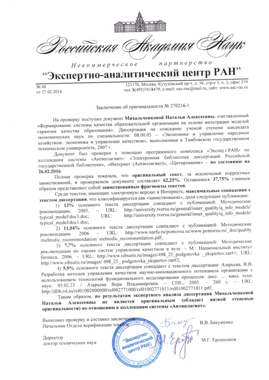 «Таким образом, по результатам экспертного анализа диссертации Михальченковой Натальи Алексеевны не является оригинальным (обладает низкой степенью оригинальности) по отношению к коллекциям Антиплагиата», — сказано в заключении центра.