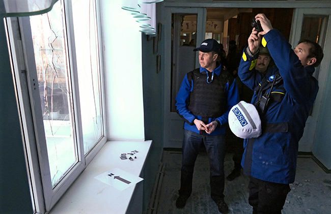 Photo: Igor Maslov / Sputnik / Scanpix OSCE observers document the effects of Ukrainian army shelling upon villages in Staromykhailivka (near Donetsk), February 18, 2016.