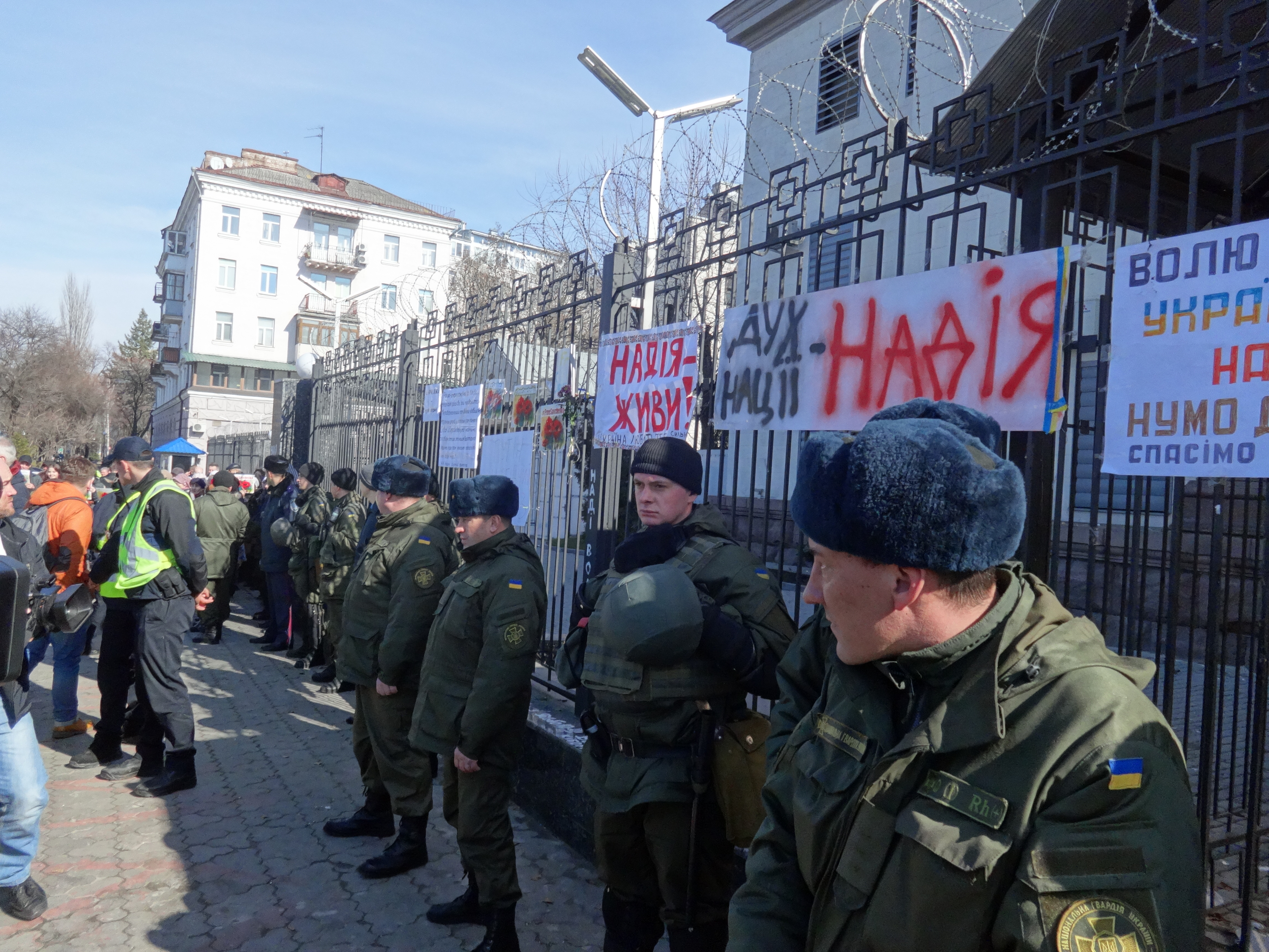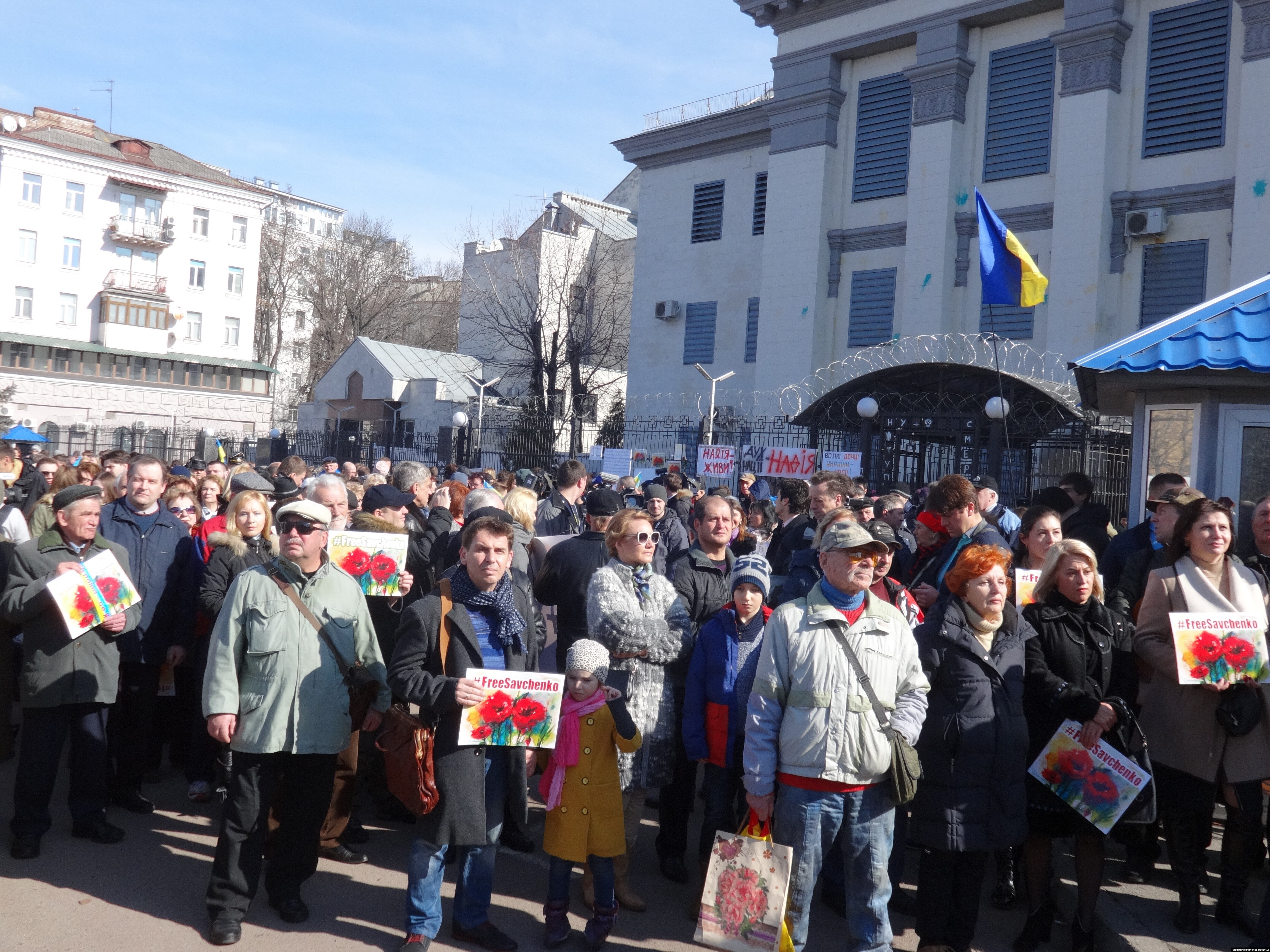 В полдень колонна демонстрантов прошла по столичному Воздухофлотскому проспекту от Министерства обороны Украины к российскому посольству. У его стен собрались несколько сотен человек - рядовые киевляне, депутаты, деятели культуры, правозащитники, представители общественных и международных организаций. Из-за инцидентов в минувшие выходные охрана диппредставительства усилена. На его ограждении участники акции разместили, в частности, плакаты с надписями «Свободу дочери Украины - Надежде! Давай действовать – спасём Надежду!», «Надежда -живи!».