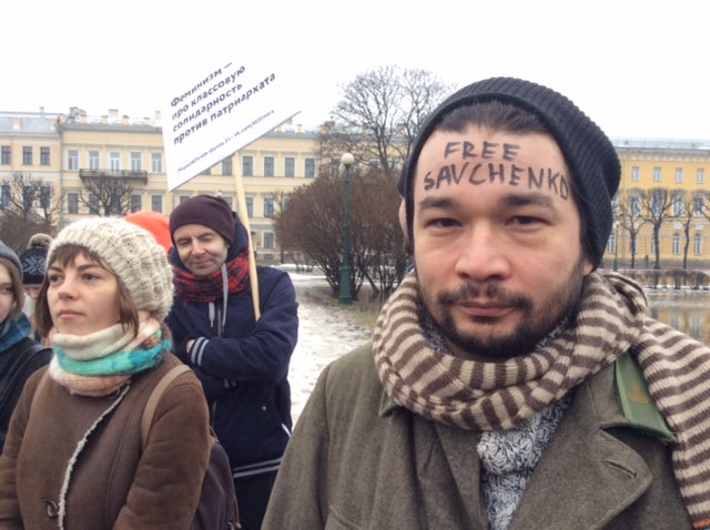 Как рассказала корреспондент Радио Свобода Татьяна Вольтская, организатором акции 8 марта выступила объединенная женская платформа левых и социальных движений Петербурга. Около 300 человек вышли на Марсово поле с самыми разнообразными лозунгами, начиная от растяжки: "Все люди – сестры" до надписи на лбу у одного из участников: "Свободу Савченко".