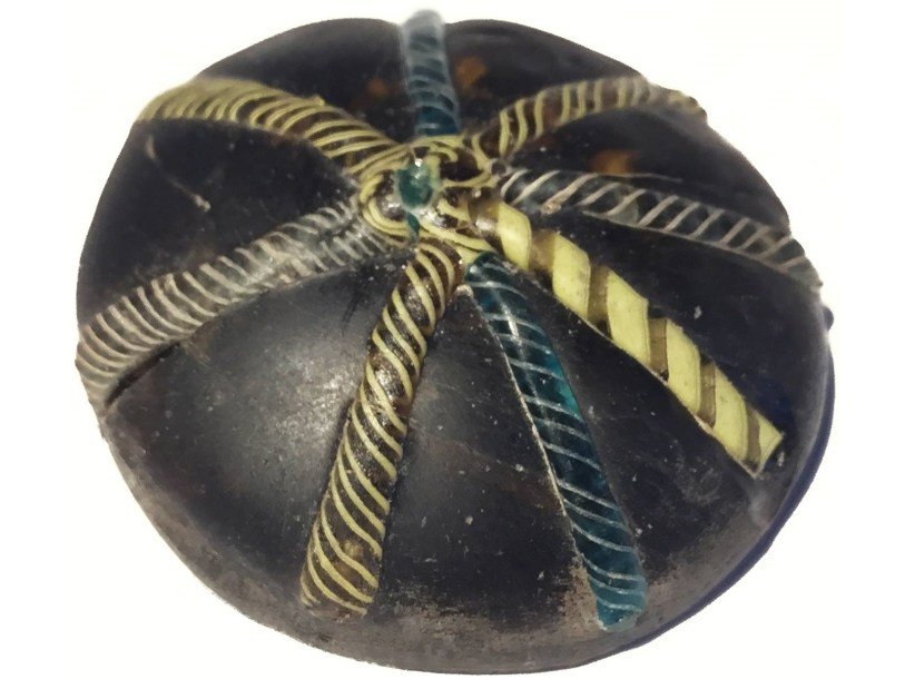 Другой интересной находкой стал округлый артефакт, сделанный из переплавленного римского стекла. По его поверхности идут несколько валиков из цветного стекла, украшенных орнаментом. Предназначение предмета остается неясным. Он мог служить украшением ювелирного изделия или сосуда или же быть фишкой в настольной игре.