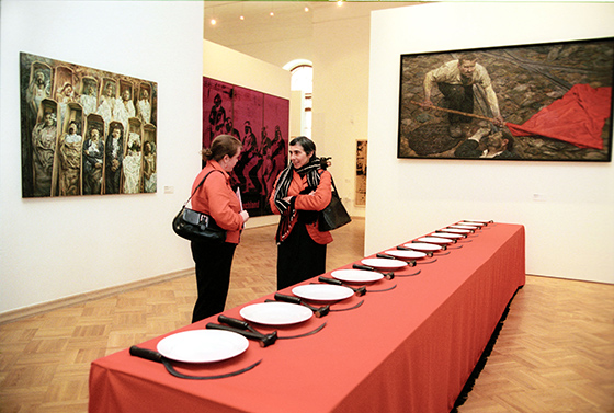 © Виктор Великжанин / ТАСС «Поднимающий знамя» (1957—1960) Гелия Коржева и инсталляция «Тайная вечеря» (1989) Андрея Филиппова на выставке «Москва — Берлин / Берлин — Москва. 1950—2000. Современный взгляд» (2004) в Государственном историческом музее — Мне казалось, что он всерьез, без иронии воспринимал коммунистические идеи.
