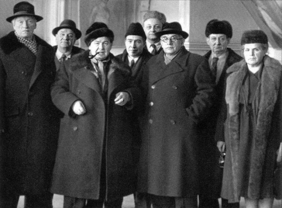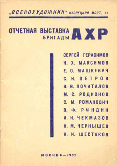 А. Герасимов (с трубкой) среди членов Академии художеств Ретроспектива Герасимова у стен Кремля казалась не менее амбициозной задачей, чем выставка в Манеже. Герасимов был знаменит как идейный, непримиримый борец с формализмом: первый президент воссозданной после войны Академии художеств СССР, лауреат четырех Сталинских премий, он лично вычеркнул из списка профессоров Владимира Фаворского и Александра Матвеева, приложил руку к последнему аресту и ссылке Николая Пунина, а в 1948 году с помощью своего покровителя Ворошилова добился расформирования щукинско-морозовской коллекции и ликвидации Государственного музея нового западного искусства (ГМНЗИ). Герасимов громил «космополитизм» Матисса и Дали от лица «подлинного реализма» с трибун академии и на страницах прессы. Его парадные портреты Сталина десятилетиями тиражировались везде, от бытовых календарей до журналов, газет и партийных многотомников, — и разом исчезли с приходом оттепели. Не удержался и он сам: Хрущев его недолюбливал, свои портреты доверял Налбандяну. Так или иначе, Герасимов был одним из самых влиятельных функционеров в искусстве 1930—1950-х, был теоретиком соцреализма (пусть тексты писал и не сам, как намекает его биограф, но это уже детали) и без стеснения сравнивал себя с Рембрандтом.