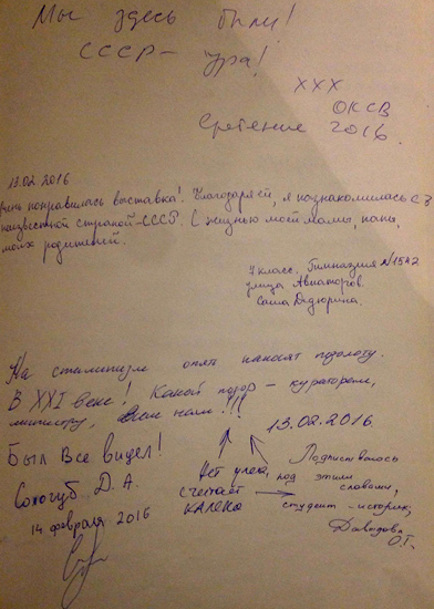 © Надя Плунгян Записи в книге отзывов на выставке Александра Герасимова Совершенно очевидно, что прятать полотна со Сталиным в запасники не является решением. Но невозможно и выставлять памятники политической истории, никак не объясняя, что они значили для современников и в каком контексте создавались: например, показывать несколько корочек Сталинской премии и не дать ремарку, в чем состоял смысл присуждения этих премий живописцам и в чем выражалось их влияние на искусство. Невозможно обсуждать, плоха или хороша живопись Герасимова «с живописной точки зрения», так как вещи Герасимова вместе с Ефановым, Хмелько, Иогансоном, Пластовым, Мешковым, Модоровым и сотнями других были частью поточной индустрии «тематической картины», предъявлявшей к живописи очень определенные требования, и за их несоблюдение исключали из профсоюза. Эти картины плохи, но ведь задачей советской власти 1930—1950-х и было окружить зрителя плохой живописью, и «плоха» она особым образом, а каким — нужно уметь назвать. При этом Герасимова недостаточно показывать только как соцреалиста. Его можно и нужно ставить рядом с Петровым-Водкиным, с Ермолаевой, с Фальком, но не для того, чтобы сравнивать качество или соединить их в целое, а чтобы показать зрителю историю целиком, вставив ее в интернациональную раму борьбы разных версий тоталитарного искусства с модернизмами XX века — «борьбы за реализм в изобразительном искусстве». А точнее, борьбы за то, что считать реализмом.