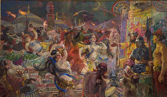 © Государственный исторический музей Александр Герасимов. Половецкие пляски. 1955. Холст, масло. Частное собрание, Москва Как писал Е. Добренко, соцреализм выдавал себя за мимесис, создавая при этом своего рода павильонную реальность наступившего социализма, где все главные достижения, к которым могут стремиться человек и общество, уже «по определению состоялись». Вариантов таких «политических витрин» у Герасимова много, начиная с прогулки «двух вождей» под грозовым небом, и некоторые исследователи считают самым откровенным иллюзионистским полотном соцреализма его псевдодокументальный холст «Гимн Октябрю» (1942). Написанная всего за шесть месяцев картина поистине огромна, на выставке она занимает целую стену от пола до потолка. Герасимов получил за «Гимн Октябрю» свою вторую Сталинскую премию — получил потому, что написал детальную инсценировку «торжественного заседания трудящихся Москвы по случаю 25-й годовщины Октябрьской революции 6 ноября 1942 года», которое вообще не было проведено.