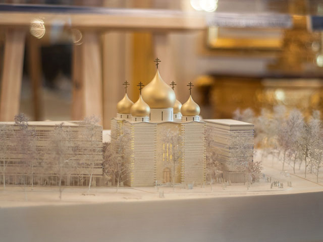 В комплекс зданий центра входит Троицкий храм. По словам вице-премьера, его внутренняя отделка "будет осуществляться в соответствии с православными канонами российскими мастерами", сообщает ТАСС.
