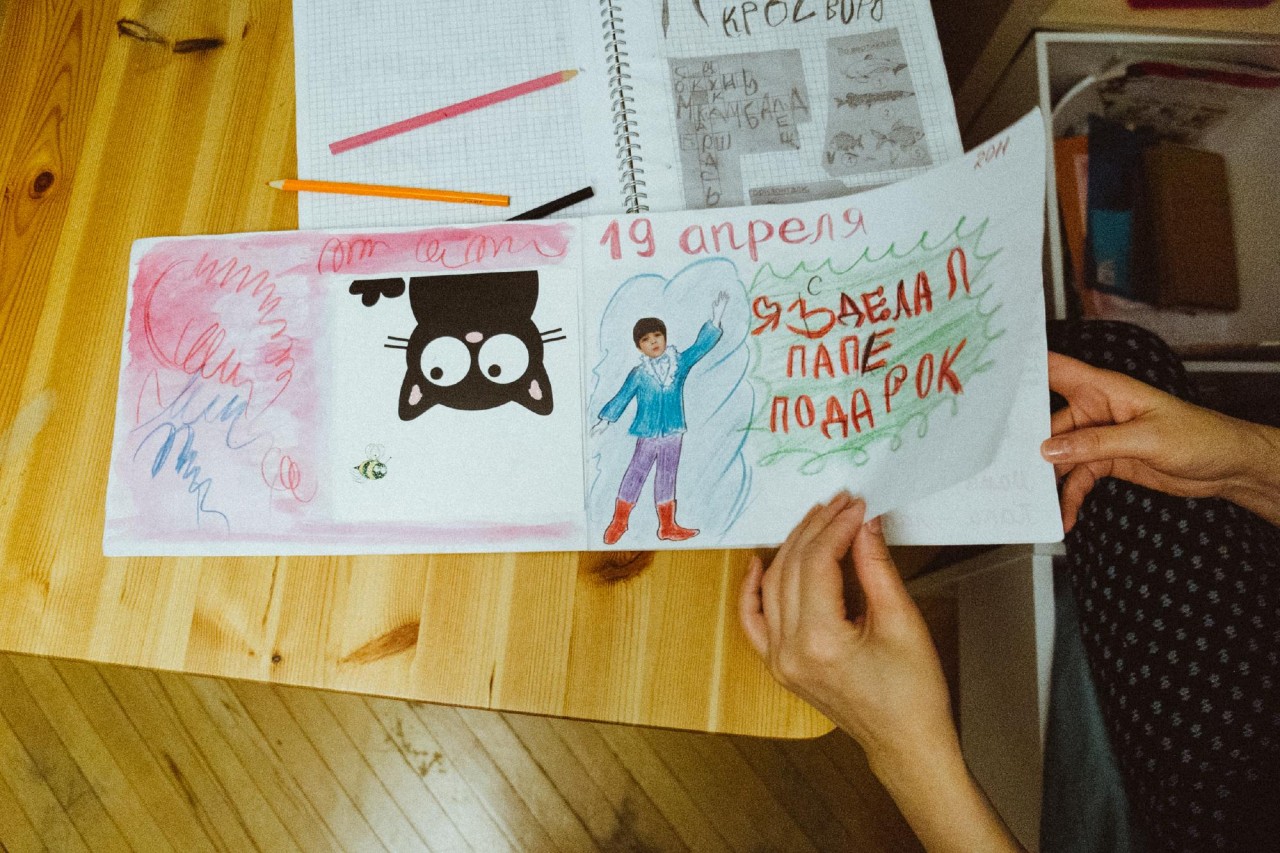 Записи из детского дневника Никиты, к которым Нина пририсовала рисункиФото: Мария Ионова-Грибина для ТД После того, как решение о приемном ребенке было принято, Нина прошла школу приемных родителей, собрала все необходимые справки и пошла в опеку. Там ей посоветовали начать с гостевого режима, Нина даже съездила было познакомиться в детский дом, но потом поняла, что это не их путь. Забирать ребенка, потом оставлять его, показалось Нине и Антону неправильным, так что они решили получать «полноценное» заключение об опеке.