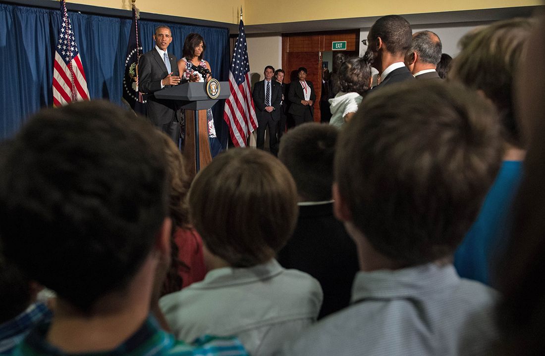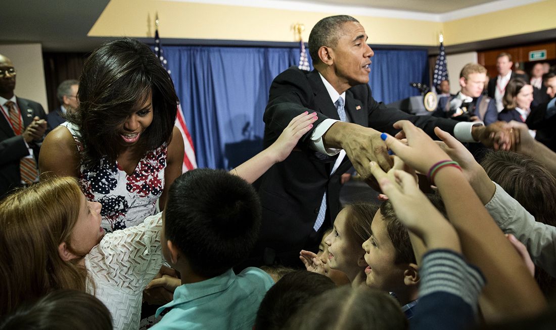 Барак и Мишель Обама приветствуют детей сотрудников посольства США в Гаване.
