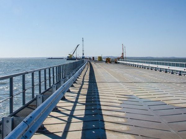 Поврежденный мост - это вспомогательное сооружение: по нему с берега доставляются грузы для строительства основного моста, перехода через Керченский пролив.