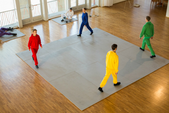 Между первой и последней частями этого триптиха Волкострелов демонстрирует «Квадрат», где четыре актера в красном, зеленом, желтом и белом спортивных костюмах (перкуссионистка — в синем) на сером квадратном настиле исполняют, шагая, соло, дуэты и трио. Квазимеханические перемещения актеров — не подражательный привет «Механическому балету» Леже — красивы, как модернистские (живописные) квадраты, которые отмеряют фигуранты из плоти и крови.