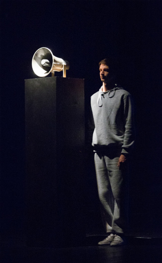 © Стас Левшин Трехчастная структура спектакля производится в трех пространствах. Несколько пьес играется в традиционном расположении сцены и зала. Однако они провоцируют в двадцатиминутной, кажется, темноте, в которую в начале спектакля (пьеса «Набросок для радио») погружен зритель, его способность сосредоточиться или заключить неведомый пока контракт с будущим представлением. Темнота насыщена шорохом реплик с помехами и прочими звуками, в том числе музыки.