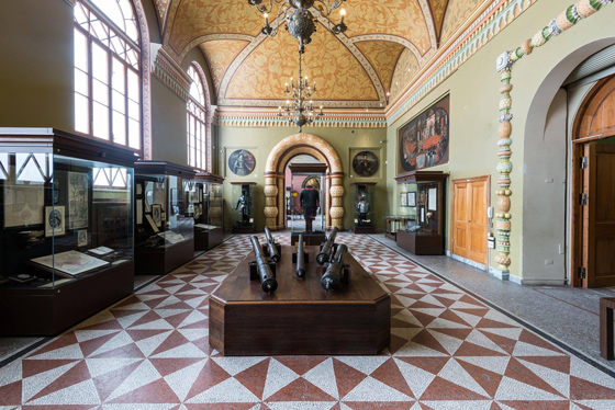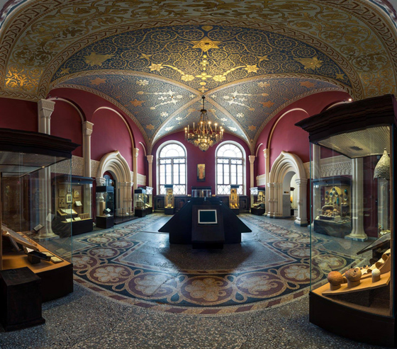 «Каждый из залов соответствует особой исторической эпохе, росписи в них повторяют знаменитые церковные и дворцовые фрески. В 1936 году было принято решение уничтожить залы, посвященные дореволюционному периоду. Росписи были закрашены, лепнина сколота, позолота снята. Более 15 лет, начиная с 1986 года, в музее велась комплексная реставрация, и сейчас его интерьеры воссозданы в изначальном виде».