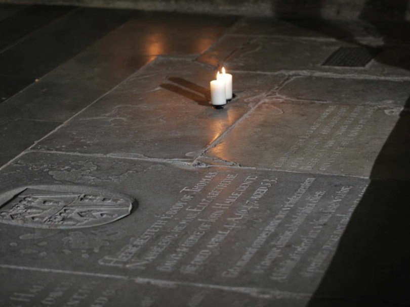 Надгробие Шекспира уже давно вызывало некоторое недоумение исследователей, так как оно слишком короткое для захоронения взрослого. На надгробной плите сделана надпись: «Добрый друг! Ради Иисуса воздержись от того, чтобы раскапывать прах заключенный здесь. Будь благословен тот, кто сохранит эти камни. И будь проклят тот, кто потревожит мои кости». Однако, если верить статье, напечатанной в журнале Argosy в 1879 году, грозное предупреждение не помогло, и неизвестные грабители могил похитили череп Шекспира еще в 1794 году.