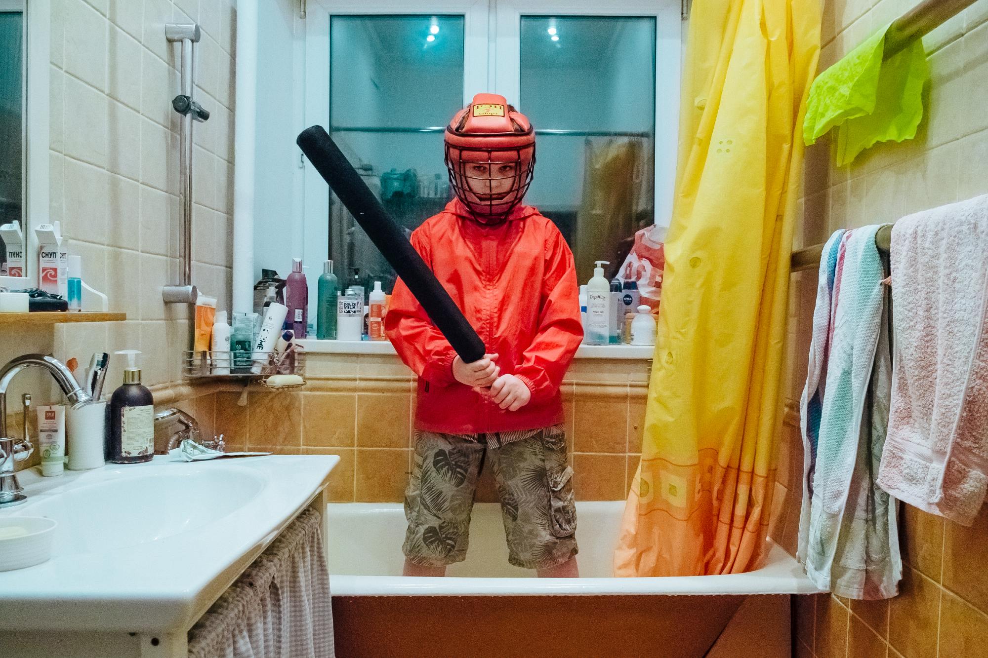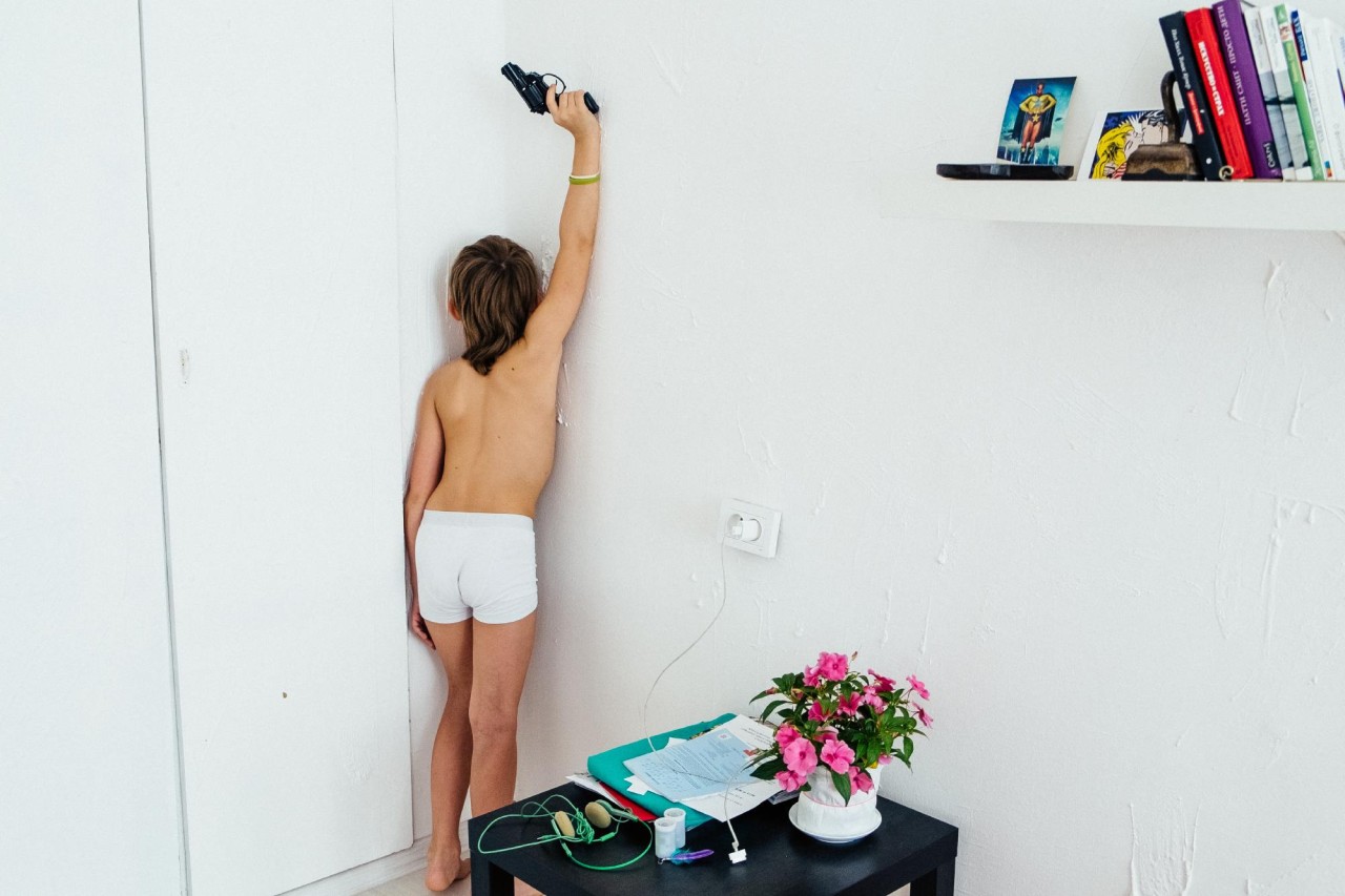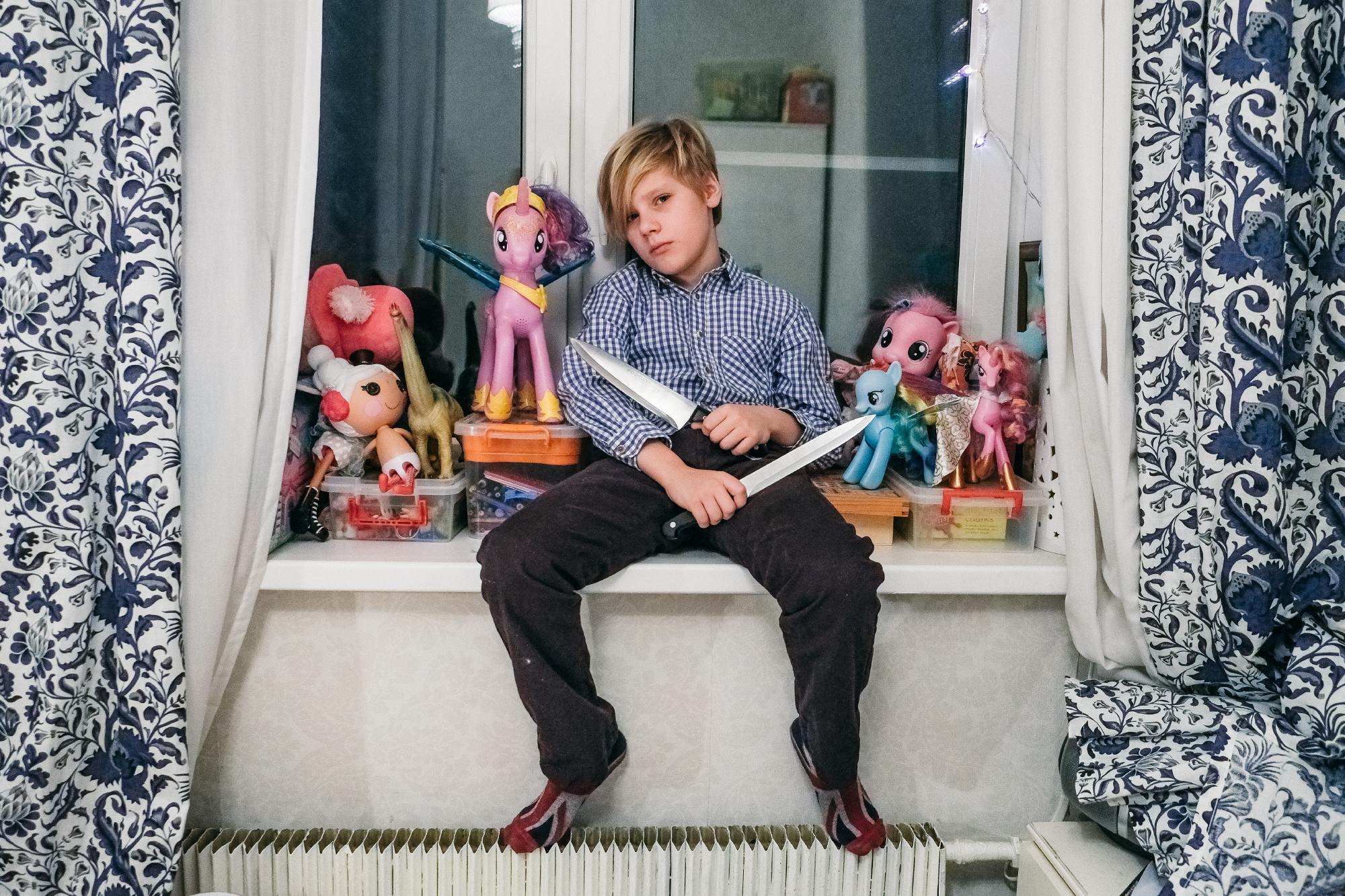 «Однажды я снимала в маленьком казахском городе Аральске во время большого праздника. На улицах было много детей с игрушечным оружием, и мне это сильно напомнило мое детство, когда мальчишки играли на улице в войнушку. Я заинтересовалась самим визуальным образом ребенка с оружием. Как ребенок смотрится с автоматом или ружьем? Понятно ли, что это игра? Ответа у меня не было», — Мария Ионова-Грибина рассказывает, с чего начался ее проект «Игра?», — серия портретов мальчиков с игрушечными ружьями, мачете, бейсбольными битами, револьверами и пулеметами.