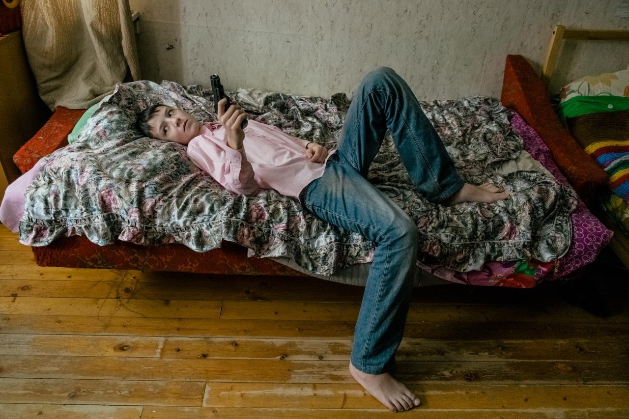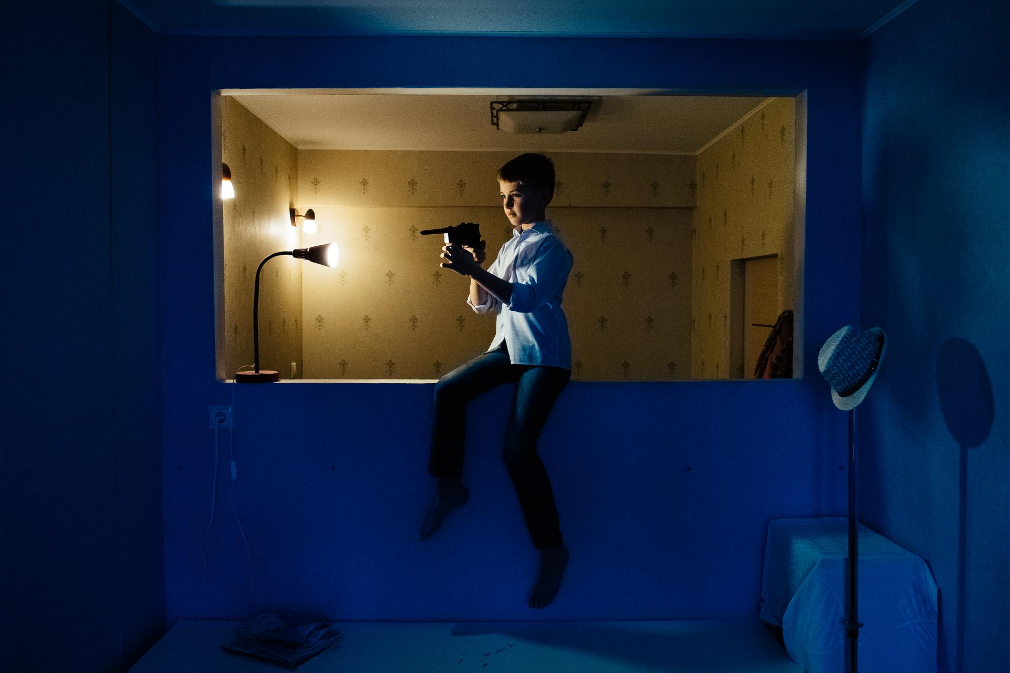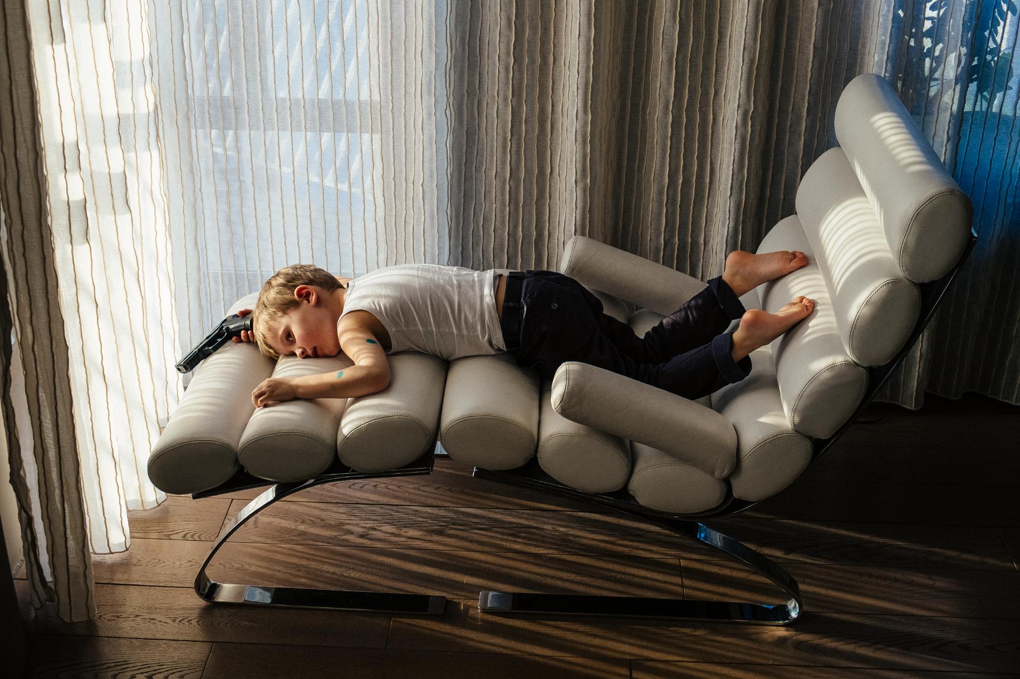 «Однажды я снимала в маленьком казахском городе Аральске во время большого праздника. На улицах было много детей с игрушечным оружием, и мне это сильно напомнило мое детство, когда мальчишки играли на улице в войнушку. Я заинтересовалась самим визуальным образом ребенка с оружием. Как ребенок смотрится с автоматом или ружьем? Понятно ли, что это игра? Ответа у меня не было», — Мария Ионова-Грибина рассказывает, с чего начался ее проект «Игра?», — серия портретов мальчиков с игрушечными ружьями, мачете, бейсбольными битами, револьверами и пулеметами.