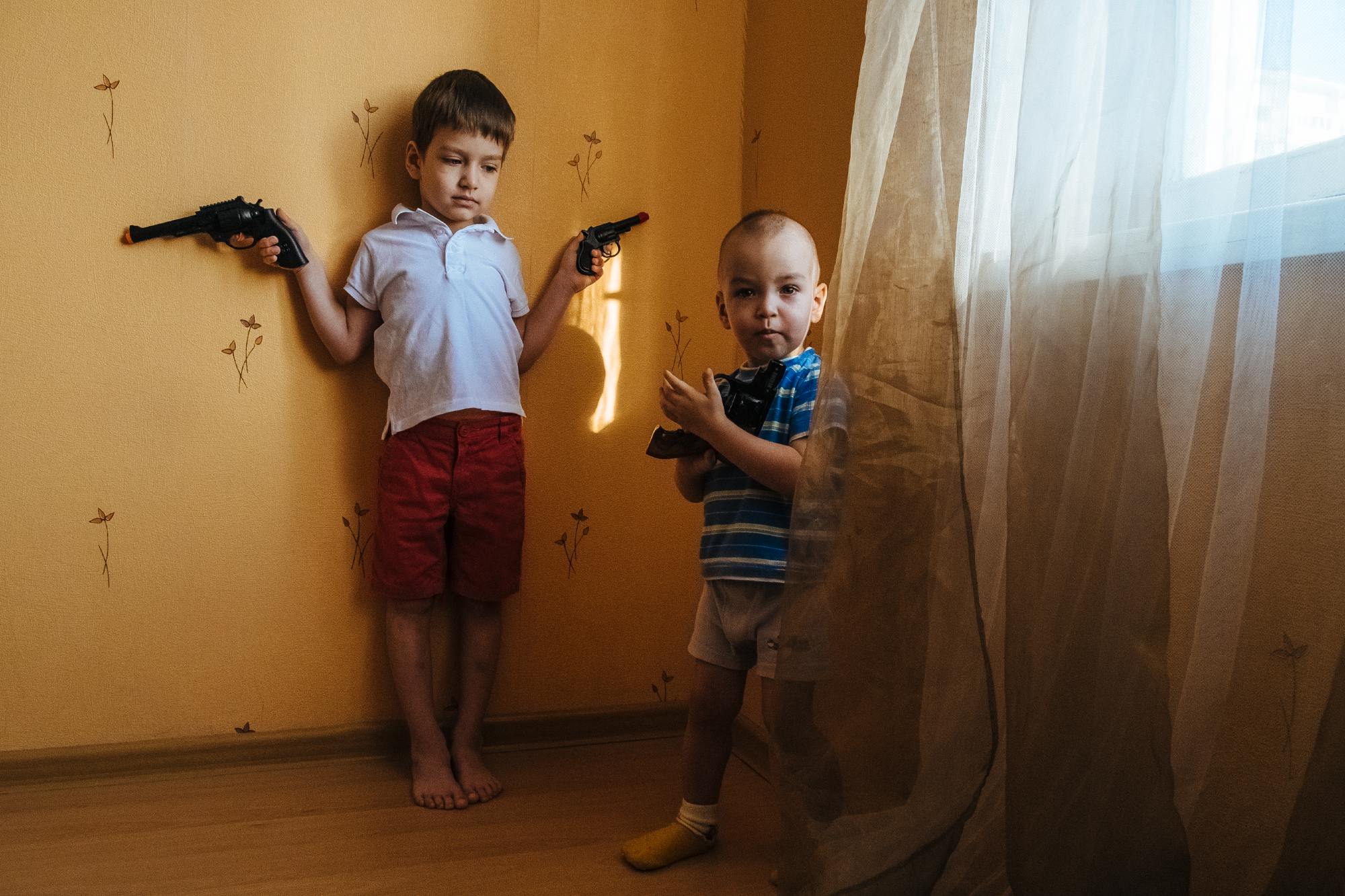 Когда два года назад Мария взялась за съемку, она столкнулась с тем, что родители детей очень по-разному относятся к игрушечному оружию. Одни считают, что мальчики с детства должны ощущать себя мужчинами, учиться защищать семью и страну, и поэтому покупают им такие игрушки. По мнению других, такие игры вредны, потому что рождают в детях агрессию. Третьи не имеют четкой позиции, но стараются донести до детей, что в реальной жизни оружие используется, чтобы убивать. Есть и четвертая группа — родители, у детей которых вообще нет игрушечного оружия, потому что они предпочитают компьютер и планшет.