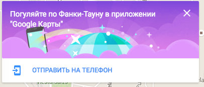 В мобильных картах Google появился Фанки-Таун — вымышленный веселый город. Чтобы найти его, надо нажать на поисковую строку в мобильном приложении, и среди предложенных вариантов найти Фанки-Таун. Если его там нет, откройте карты в браузере и кликните по такому баннеру: