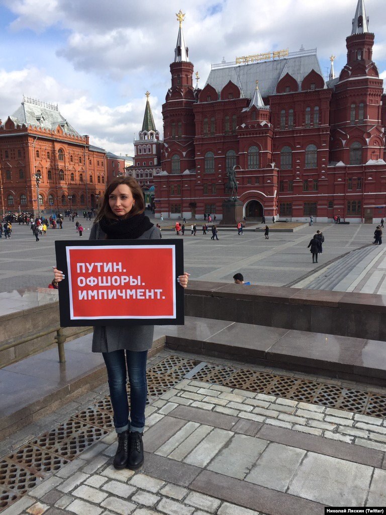 В Москве на Манежной площади активисты провели серию одиночных пикетов с требованием импичмента президента России Владимира Путина в свете публикации журналистского расследования о связанных с ним офшорных компаниях. Об этом в "Твиттере" сообщил оппозиционер Николай Ляскин.
