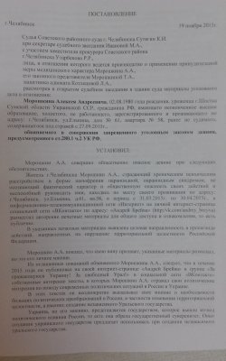 Вот уже несколько месяцев в Областной клинической специализированной психоневрологической больнице № 1 города Челябинска находится отправленный туда на принудительное лечение Алексей Морошкин. На Морошкина было заведено дело о призывах к нарушению территориальной целостности РФ (появившаяся в конце 2013 года на фоне событий на Майдане и приобретающая все большую популярность ст. 280.1 УК). Причиной стали его посты в соцсети «ВКонтакте» о необходимости создания Уральской Народной Республики, которые он писал под псевдонимом Андрей Брейва.