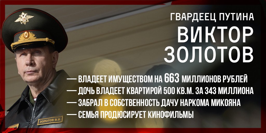 По его словам, в эту сумму, в частности, входит квартира дочери главы Нацгвардии Жанны Золотовой в Москве, общая площадь которой составляет почти 500 квадратных метров. Эта квартира была куплена в 2011 году, ее стоимость ФБК оценил более чем в 300 миллионов рублей. Кроме этого, борцы с коррупцией обнаружили в собственности Золотова участок земли в Подмосковье стоимостью около 200 миллионов. Навальный заявил, что этот участок является бывшей советской госдачей Зубалово-2, расположенной рядом с одной из резиденций Иосифа Сталина. Ранее "Новая газета" обнаружила в собственности семьи Золотова две квартиры в Москве, а также дома в Геленджике, Сочи и элитном подмосковном поселке Барвиха.