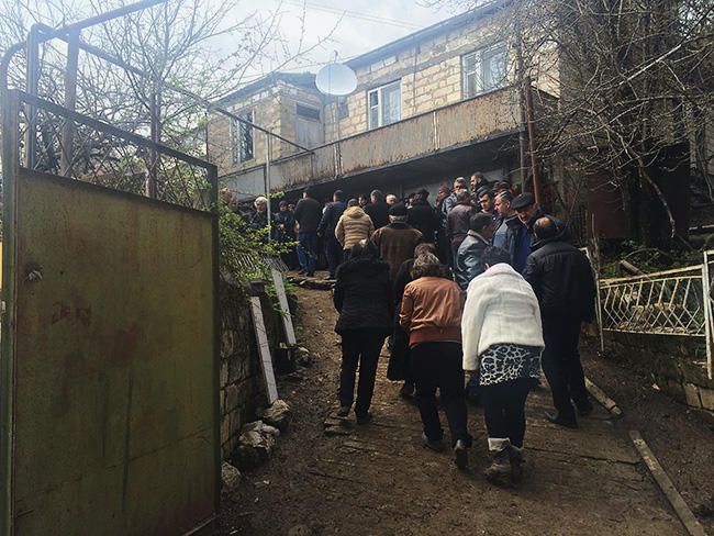 The funeral service for Vaghinak Grigoryan was held at his family's house, located on the village's main street, which stretches across a mountain slope. Dozens of cars were parked by the road, and about 150 people gathered in and in front of the house.