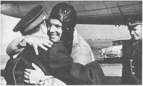Это было 12 апреля 1961 года. Я работал фотокорреспондентом в газете «За родину!», собрался, уже аппаратуру в сумку сложил, собрался идти на съемку, думал, что сейчас будет типа читка газет или митинги какие-то, потому что он в космосе — Гагарин. Приходит корреспондент «Красной звезды», который в нашем же помещении снимал комнату, и говорит: «Виктор, быстро собирайся, поедем». «Куда?». «Расскажу после». Садимся к нему в машину и едем в направлении авиационного завода. Подъезжаем, нас на основной проходной не пускают, потому что только что начальство все проехало. Что делать? Я говорю: «Я знаю еще одну проходную, через которую грузовые машины ходят. Поехали туда, попробуем». Поехали туда, там удачно проехали. Женщина на вахте стояла, она нас пропустила: со мной полковник, я аппаратурой увешанный весь. Смотрим: около взлетного поля стоит много начальства. Нас остановили: «Кто такие?». Я сразу показал корочки, что он корреспондент «Красной звезды» из Москвы. «Пожалуйста, встаньте только в сторонку». Мы встали в сторонку, но ничего, ни разговоров, ничего не знаем, мы только наблюдаем. Наблюдаем — появляется самолет ИЛ-14, садится на основную полосу и потихоньку идет-идет. Смотрим, в чем дело, не поймем — все начальство абсолютно садится в машины. Самолет примерно с нами сравнялся, а потом пошел вдаль к железной дороге. Я сказал водиле: «Давай за ним. Если можешь — обгоняй, чтобы мы первые были». Он так и сделал, он немножко обогнал начальство, мы стороной слева шли. И только самолет заглушил двигатели, развернулся, тут все встали, пока трап подавали. Но у меня главная задача была, я не представлял, потому что до этого не показывали, это сейчас показывают, как одевают скафандры, а до этого не показывали, как выглядит космонавт, вот у меня задача была: сейчас будет спускаться с трапа, называют майор Гагарин. Значит он в майорской форме? Смотрю — нет, в форме космонавта, которую я первый раз вижу, в оранжевом костюме, еще старого образца шлемофон летный. Он начал спускаться по трапу. У меня две камеры было, одна с 80-миллиметровым, типа портретника на «Зените», и широкоугольник на «Киеве» — это для близкого боя. Я начал съемку. Два кадра я сделал, пока он шел по трапу, а потом началось обнимание, первый крик был «Юра!». Я думаю: кто же это за старший лейтенант кричит «Юра»? Оказалось, это его дублер Титов. Они обнялись первыми, а потом уже пошло начальство обниматься. Здесь в это время Генерального конструктора Королева не было.