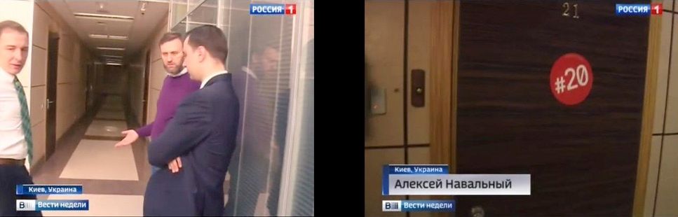 В сюжете сотрудники ВГТРК пытаются взять комментарий у Алексея Навального возле офиса Фонда борьбы с коррупцией в московском бизнес-центре «Омега-плаза». При этом титры на экране говорят, что дело происходит в Киеве.