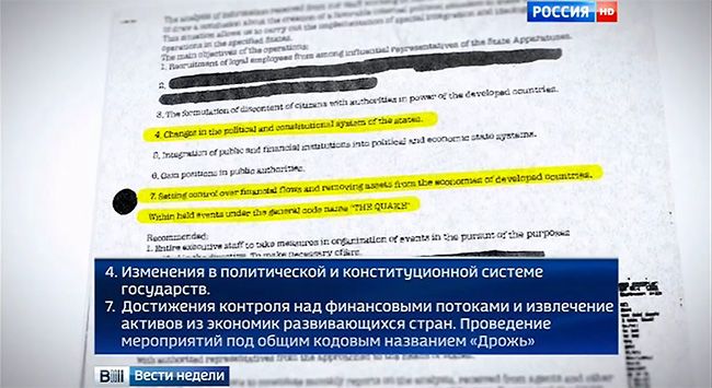 В сюжете, показанном по «России 1», утверждается, что за деятельностью Алексея Навального стоит глава фонда Hermitage Capital Уильям Браудер, который, в свою очередь, представляет британские и американские спецслужбы. Весь рассказ построен на неких донесениях агентов ЦРУ и британской разведки. Совсем вкратце история такова: в 1986 году ЦРУ начала секретную операцию «Дрожь» по изменению политики в Восточной Европе и СССР; агенты продолжили работать над ней и после распада Советского Союза.